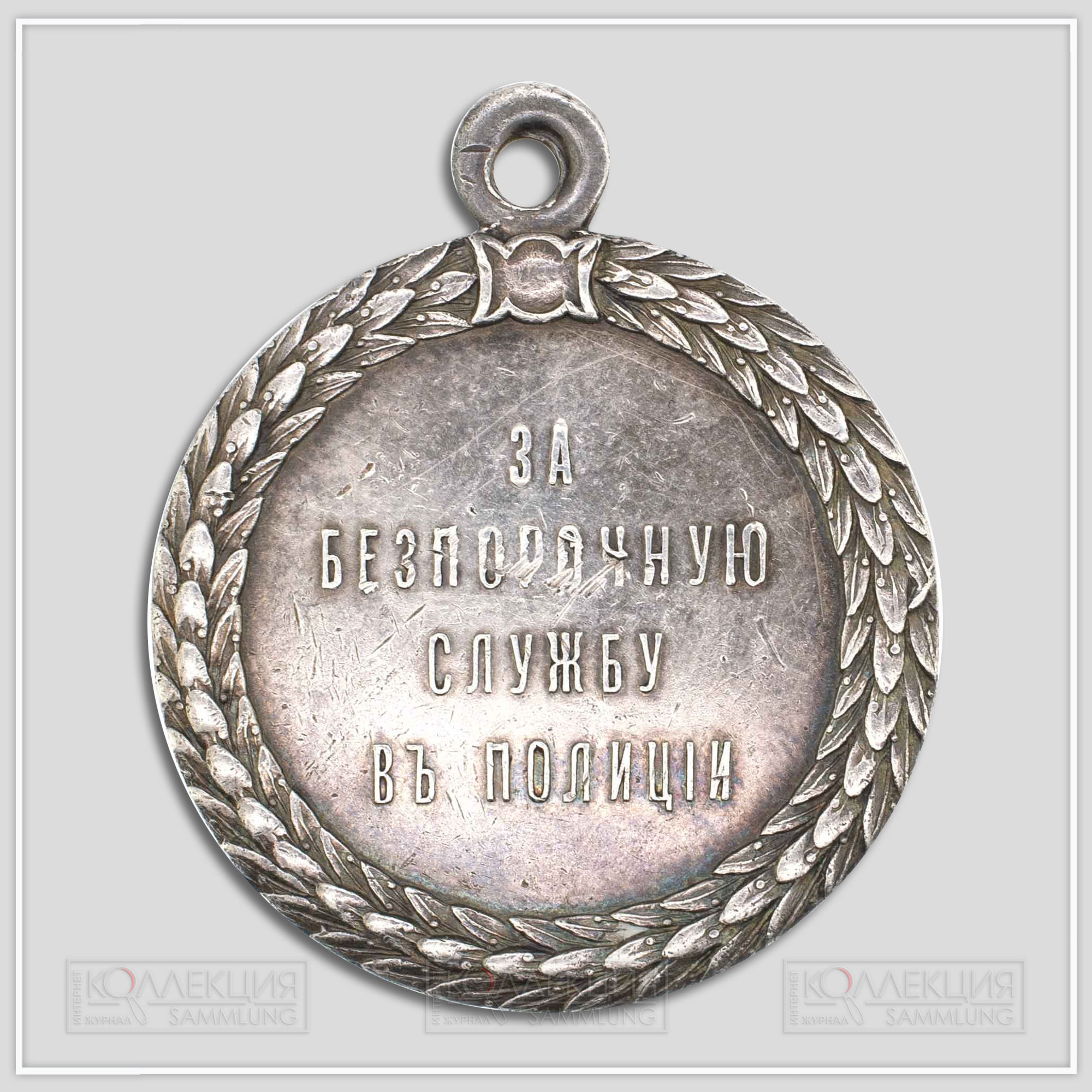 На реверсе сточена надпись «ЗА БЕЗПОРОЧНУЮ СЛУЖБУ ВЪ ПОЛИЦIИ» и выгравирован неизвестный вензель).
