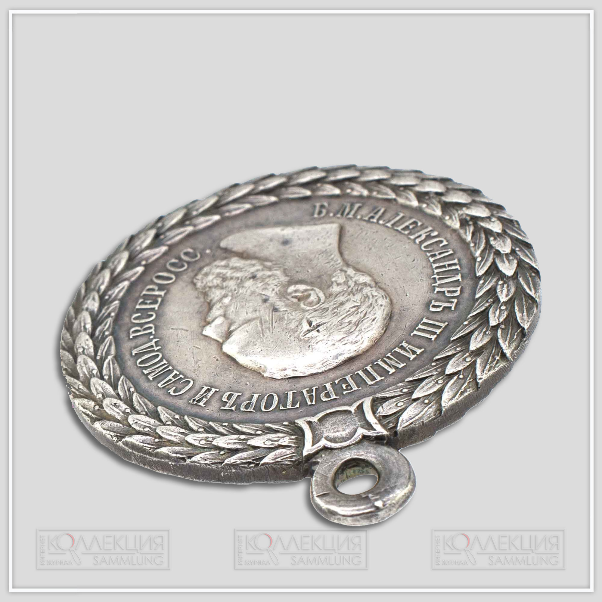 Л. С. Портрет императора Александра III вправо. Внизу у окружности: «Л. ШТЕЙНМАНЪ». По окружности сплошной лавровый венок со щитком наверху.