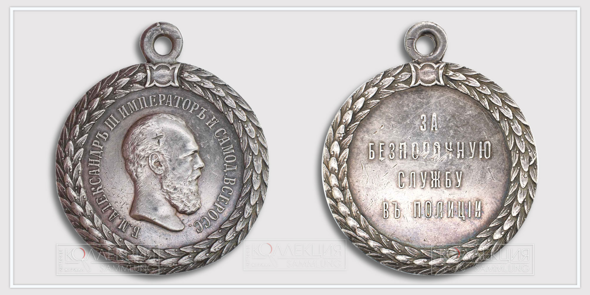Учреждена 17 декабря 1876 г. в царствование императора Александра II. Награждали нижних чинов полицейских и пожарных команд за безупречную службу в должности не менее 5 лет; прослужившие затем ещё не менее 5 лет получали право носить медаль и после увольнения из команд. Выдача медалей была возложена на Капитул императорских и царских орденов. С 18 января 1887 г. медалями стали награждать и полицейских урядников. С 25 февраля 1883 г. повелением императора Александра III, объявленным министром внутренних дел, рисунок лицевой стороны медали был изменён: вокруг портрета императора стали помещать надпись. Поводом послужило письмо министра внутренних дел графа Д. А. Толстого министру императорского двора графу А. Ф. Адлербергу от 8 ноября 1882 г., в котором граф Толстой сообщал, что «чины Киевской городской полиции, при выдаче им в текущем [1882 г.] году медали с надписью „за беспорочную службу в полиции“ выразили недоумение по поводу помещения на лицевой стороне под портретом Государя Императора фамилии гравёра „Л. Штейнман“». В связи с этим министр просил впредь не помещать на медали фамилии гравёра. Граф А. Ф. Адлерберг запросил мнение министра финансов Н. X. Бунге и в ответном письме от 29 декабря 1882 г. сообщал, что, как считает министр финансов, не помещать на медалях фамилии граверов будет неудобно, т. к. «фамилии эти имеют довольно важное значение в нумизматическом отношении», но «в видах же устранения на будущее время подобных случаев» полагает на наградных медалях выбивать только начальные буквы имени и фамилии медальера, и, кроме того, находит полезным помещать на медалях «за беспорочную службу в полиции» вокруг портрета надпись: «Божиею Милостию Александр III Император и Самодержец Всероссийский», — как это делается на всех медалях, выдаваемых из Капитула орденов. По докладу министра внутренних дел император 25 февраля 1883 г. разрешил помещать на этих медалях надпись.