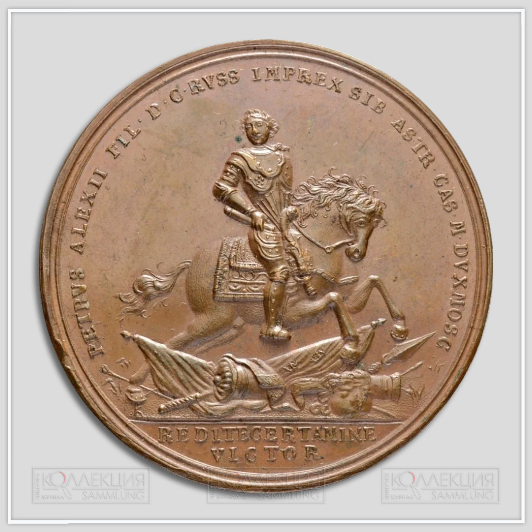 Гравер И. Кеттель. Пётр I скачет на коне через груду трофеев. Рев. Сидящая на троне Слава держит лавровый венок.
